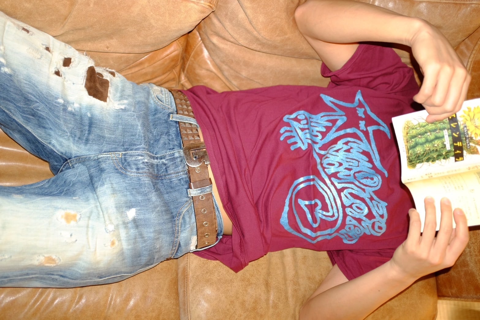 なんとも知的なあずき色に大胆にメタルブルーのラメ入りロゴがスペシャルな一枚!